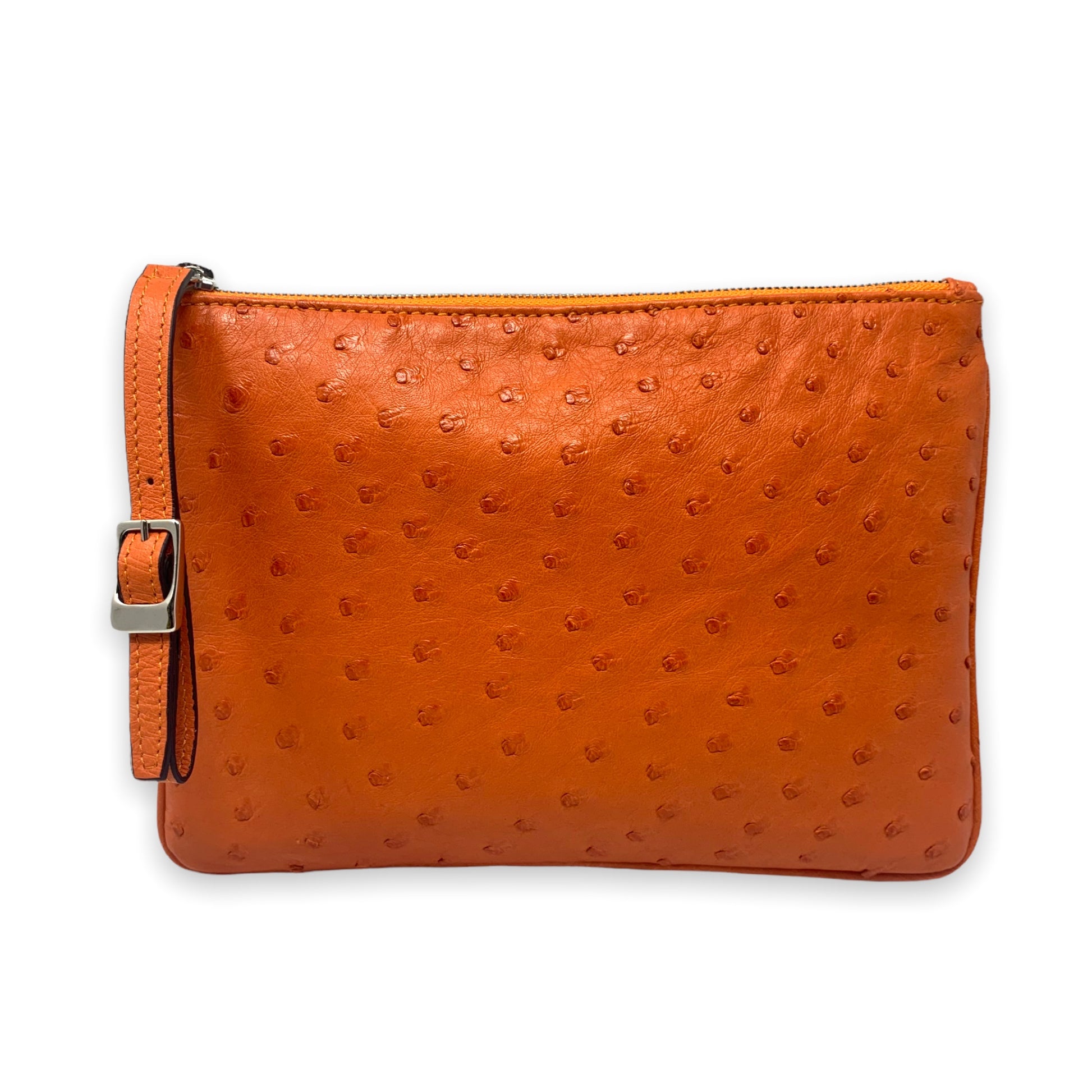 Flat pouch in real ostrich and plain leather on the back with wrist handle.