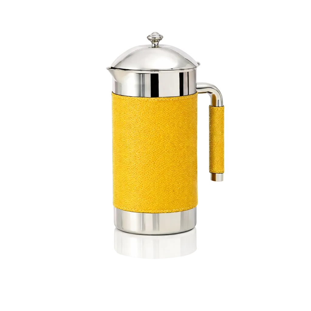 Partially leather covered insulated polished stainless steel carafe. Maintains liquids’ temperature warm and cold.