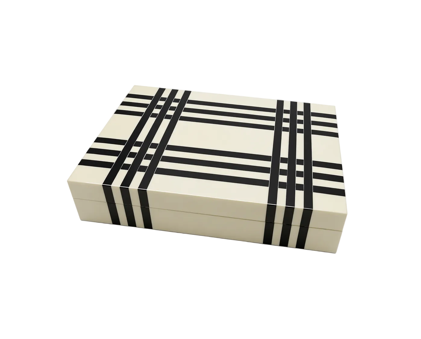 Scatola decorativa dal design grafico e contemporaneo, caratterizzata da un elegante contrasto tra avorio lucido e linee nere decise. Il motivo geometrico, rigoroso ma raffinato, crea un equilibrio visivo di grande impatto, perfetto per ambienti moderni e ricercati.