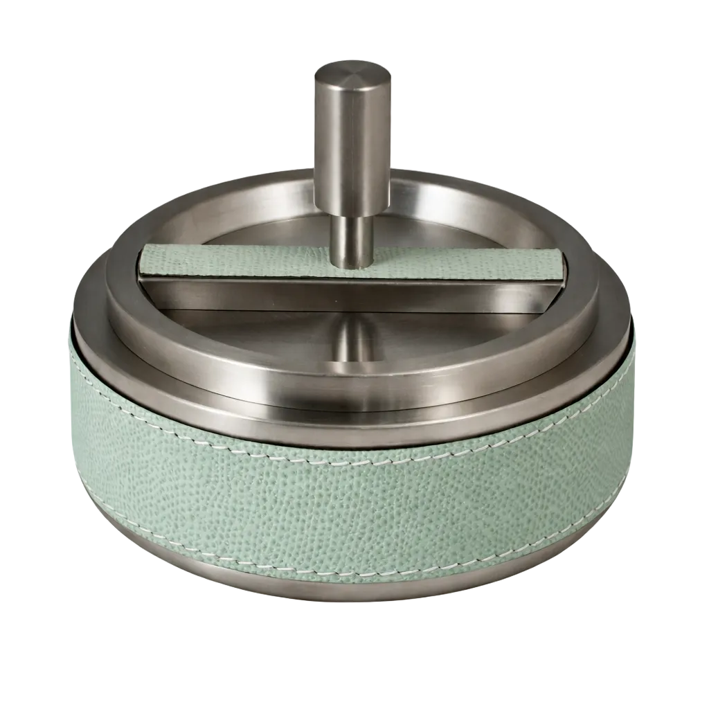Un oggetto di design che unisce funzionalità e raffinatezza contemporanea. Questo posacenere girevole è realizzato in acciaio satinato di alta qualità, impreziosito da un rivestimento in pelle.