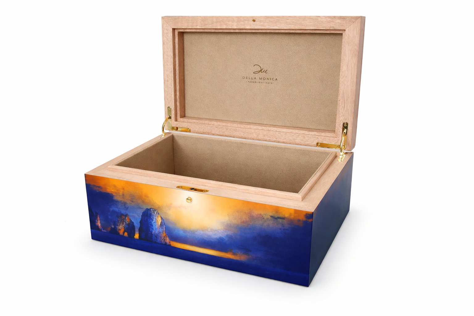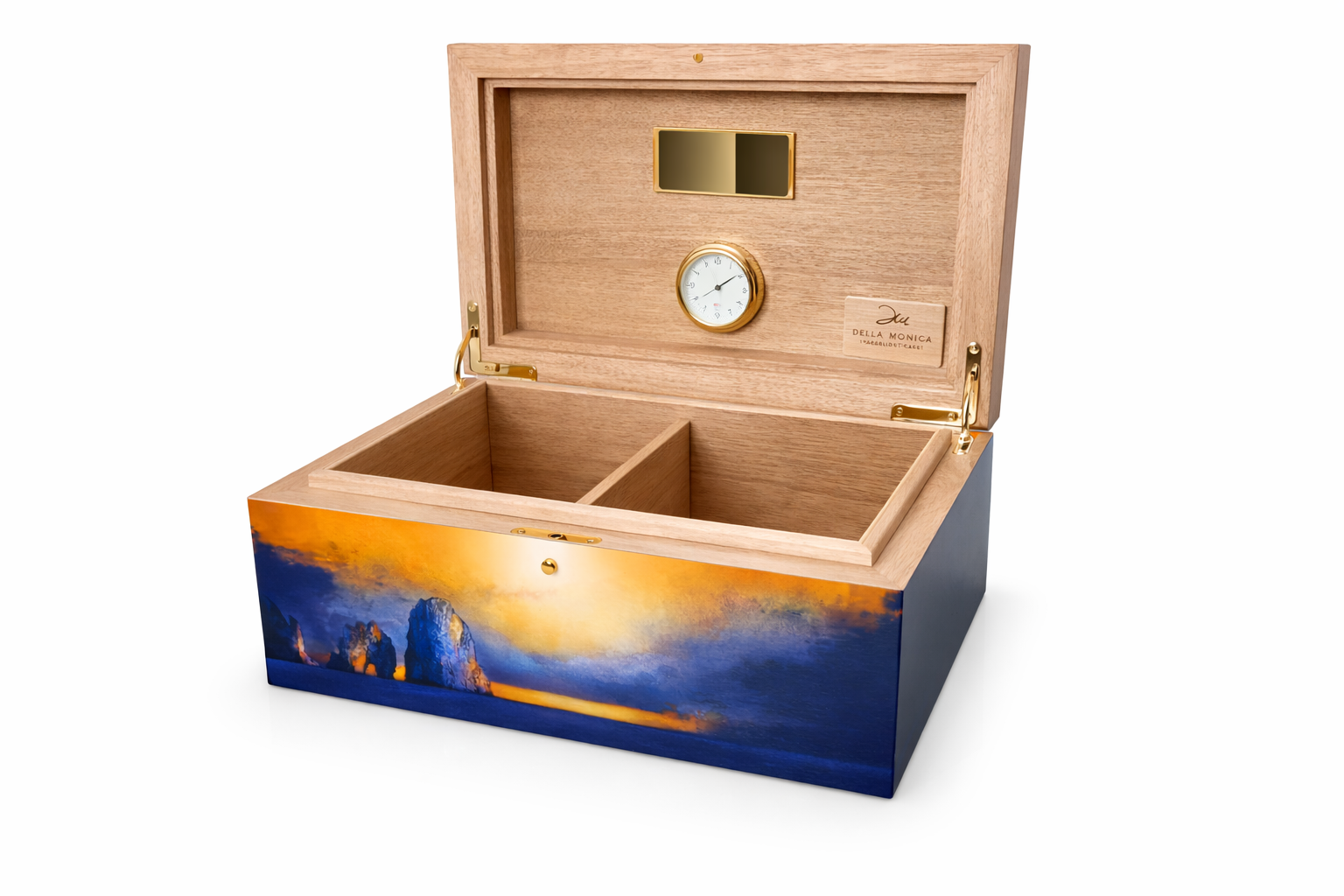 Ispirato ai Faraglioni di Capri al tramonto, questo humidor in edizione limitata cattura la magia delle ultime luci del giorno che si riflettono sul mare dell’isola.