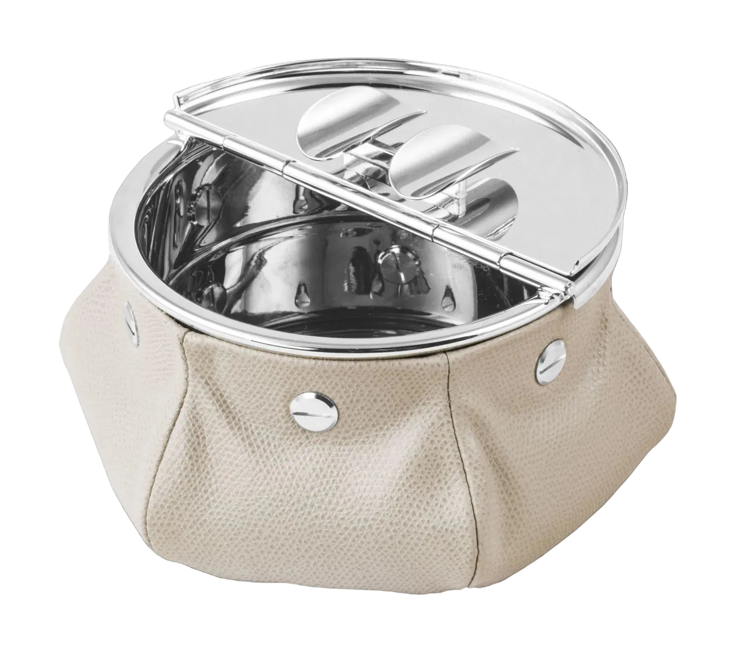 Posacenere in ottone antivento con finitura in palladio, fissato su una borsa in pelle riempita con microsfere metalliche da 1 kg che conferiscono un'elevata stabilità. Perfetto per jet e yacht. Peso totale 1,2 kg.