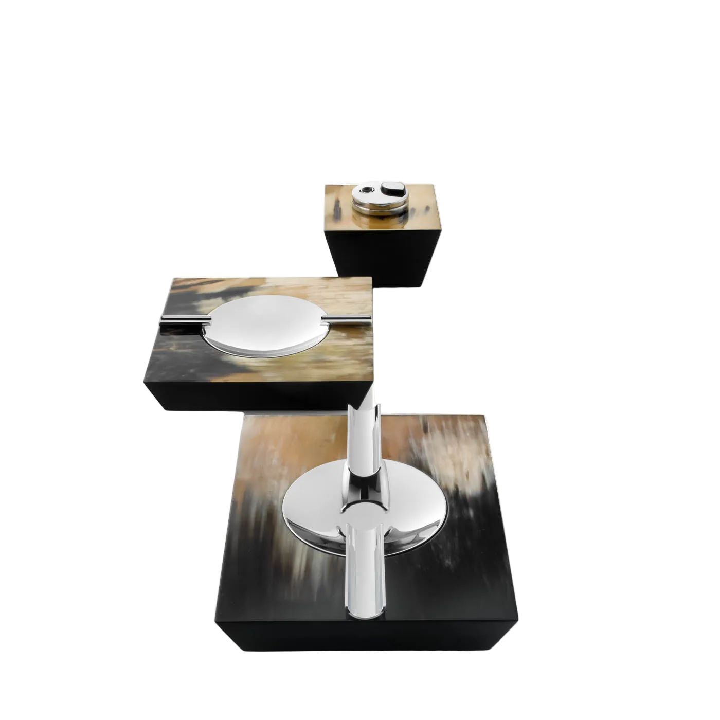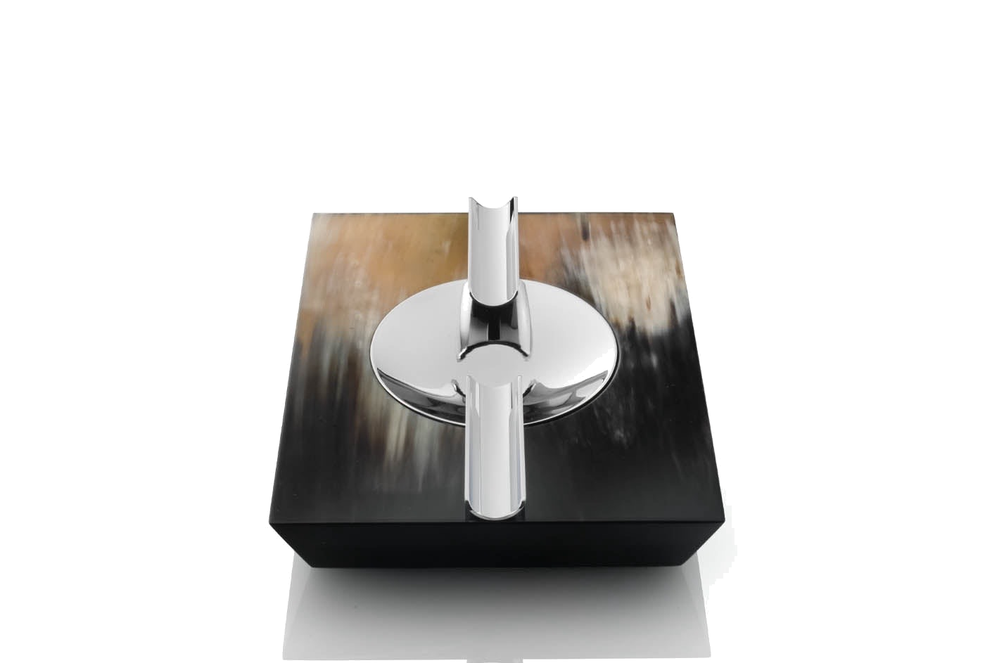 Posacenere realizzato a mano in legno laccato nero lucido con raffinati inserti in corno scuro e ottone cromato.