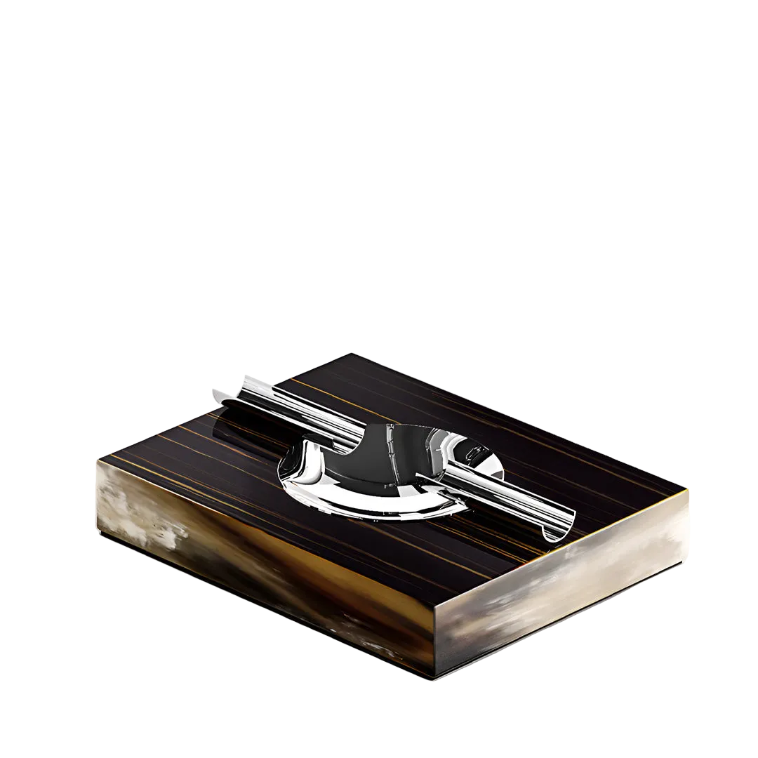 Posacenere in corno, ebano glossy e ottone cromato.