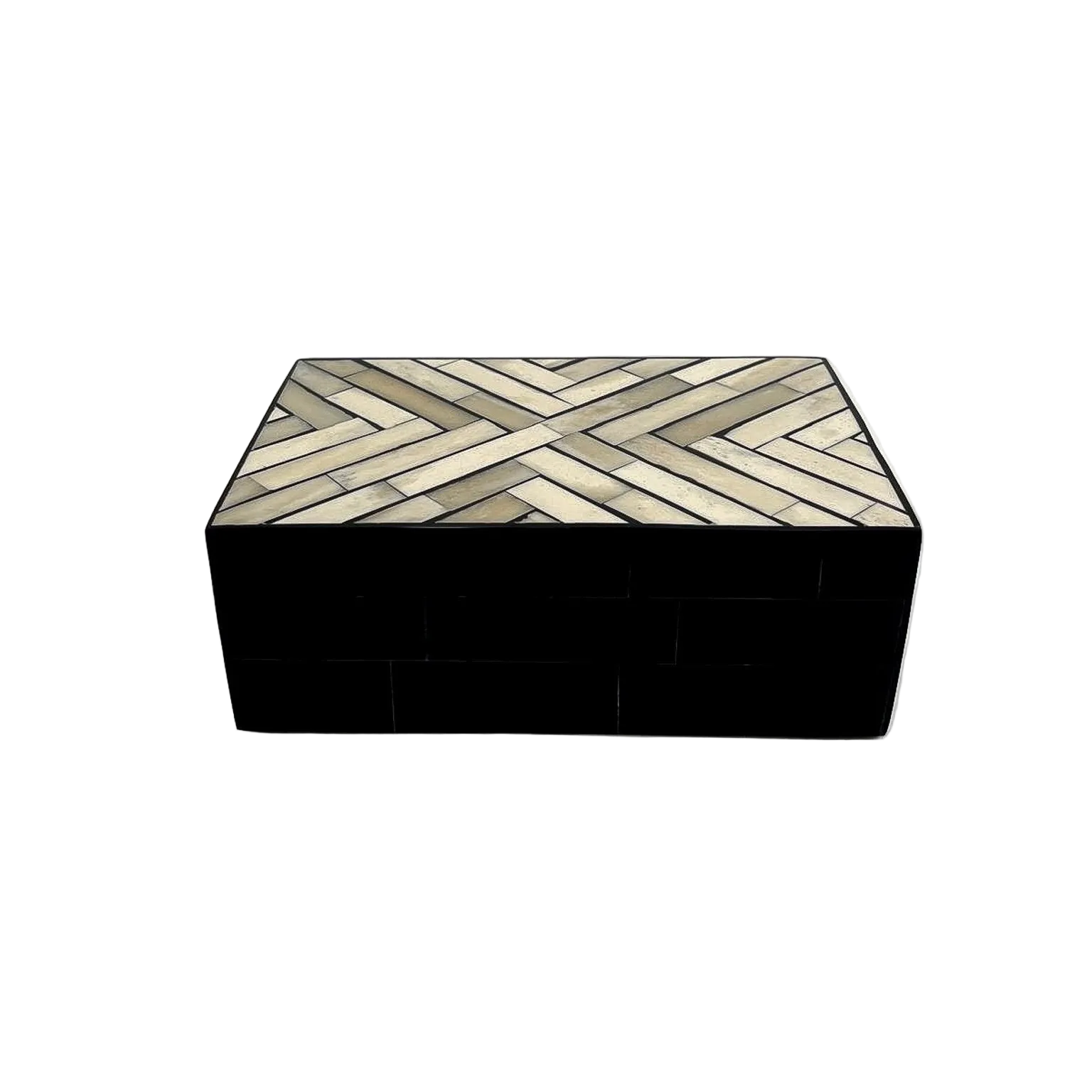 Scatola decorativa dal design sofisticato, caratterizzata da un elegante contrasto tra la struttura nera opaca e il coperchio intarsiato con motivo geometrico a spina di pesce. Le tonalità naturali e le variazioni materiche creano un gioco visivo raffinato, capace di catturare lo sguardo con discrezione.